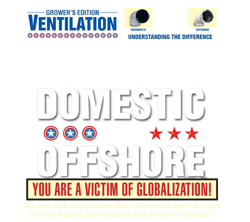 You can fight back by buying your ducting and ventilation supplies from ThermoFlo. All ThermoFlo products are made right here in North America and engineered to surpass UL and ETL certification standards. Unlike offshore knock-offs, we use environmentally sound materials and state of the art techniques to ensure everything we sell is of the best quality. When you buy ThermFlo you can rest assured that you're receiving locally manufactured products designed and engineered with your best interests in mind.